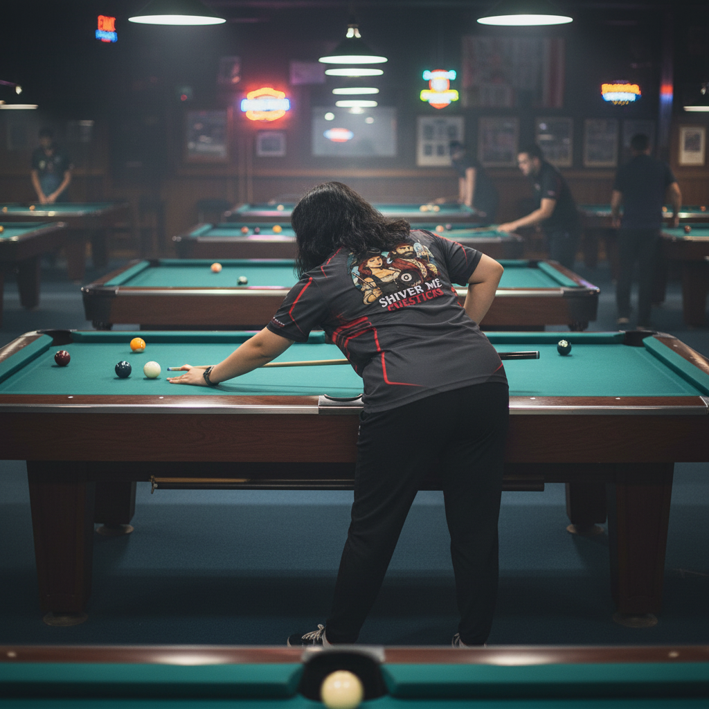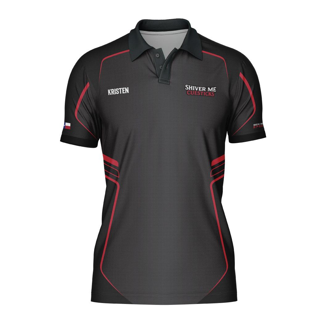 This custom billiards jersey was designed specifically for the Shiver Me Cuesticks team, combining a clean professional look with premium performance materials. Built for competitive play, this custom pool shirt delivers comfort, durability, and a polished presence at the table.